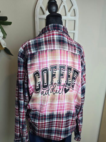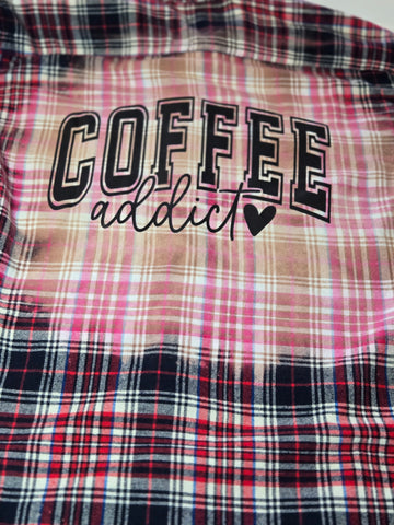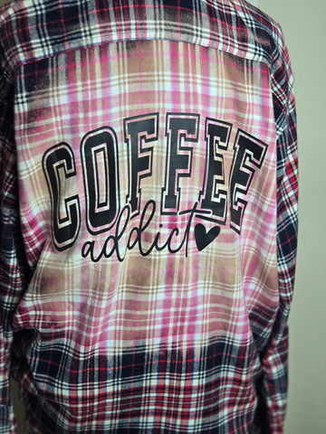 Hand bleached and screen printed with words "Coffee Addict"