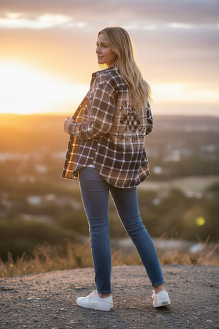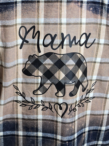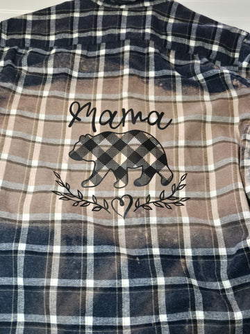 Blue Plaid bleached upcycled flannel.  Screen printed on back with "Mama Bear."