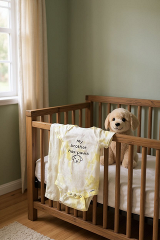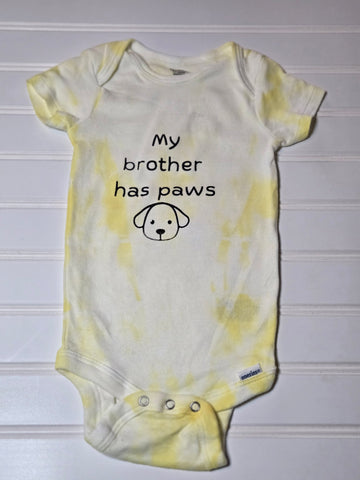 Hand dyed yellow baby bodysuit. My brother has paws.