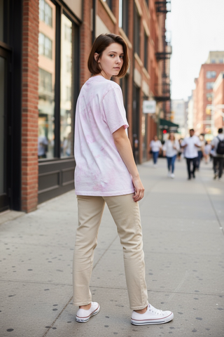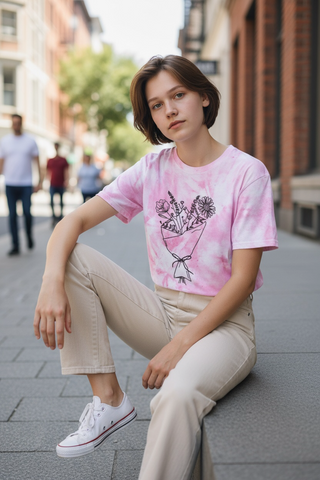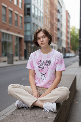 Pink Tie Dye Tee with Bouquet of Flowers - Size Large