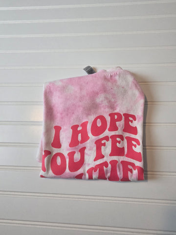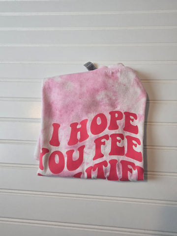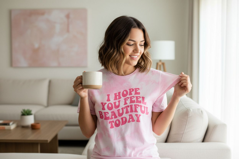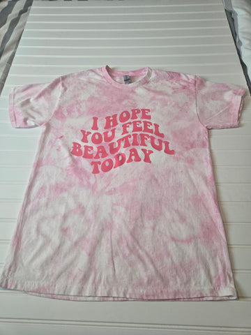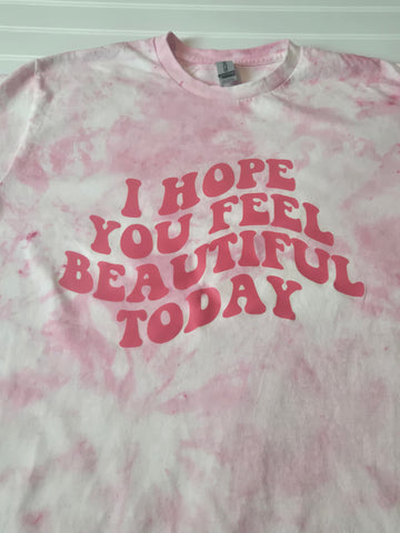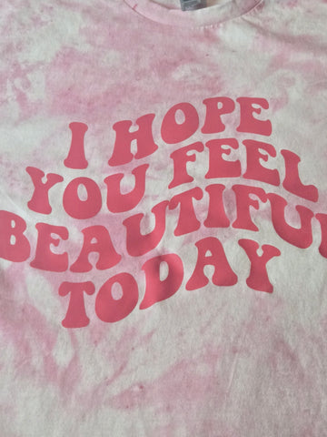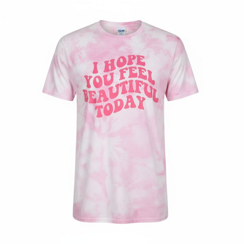 This pink tie-dyed tee features the uplifting message “I hope you feel beautiful today” — a sweet reminder for yourself or someone you love. Each shirt is hand-dyed, creating a one-of-a-kind swirl of soft pink tones, so no two will ever be exactly alike.