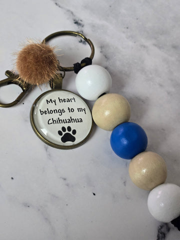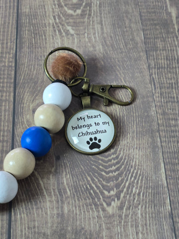 Add a pop of color and personality to your every day essentials with this handmade beaded keychain with a charm that reads "My heart belongs to my Chihauhua". Each keychain we make is carefully handcrafted with high quality beads and sturdy hardware, making it both beautiful and durable. Additionally each one is a limited edition of one, therefore making it a one of a kind gift.