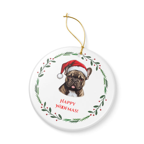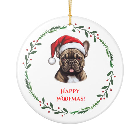 Each ornament features a sweet Frenchie design with the phrase “Happy Woofmas” — a festive favorite for pet parents and Frenchie lovers alike!