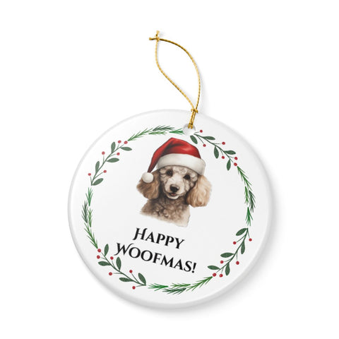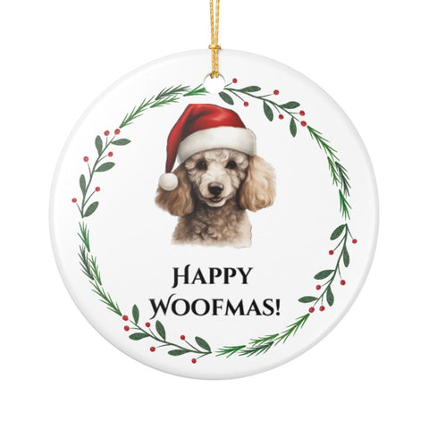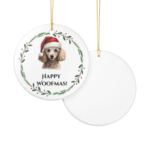 Each ornament features a sweet Poodle design with the phrase “Happy Woofmas” — a festive favorite for pet parents and Poodle lovers alike!