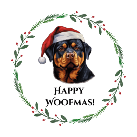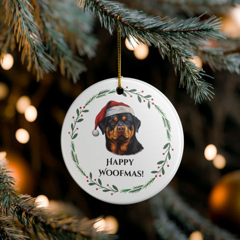 Each ornament features a sweet Rottweiler design with the phrase “Happy Woofmas” — a festive favorite for pet parents and Rottweiler lovers alike!